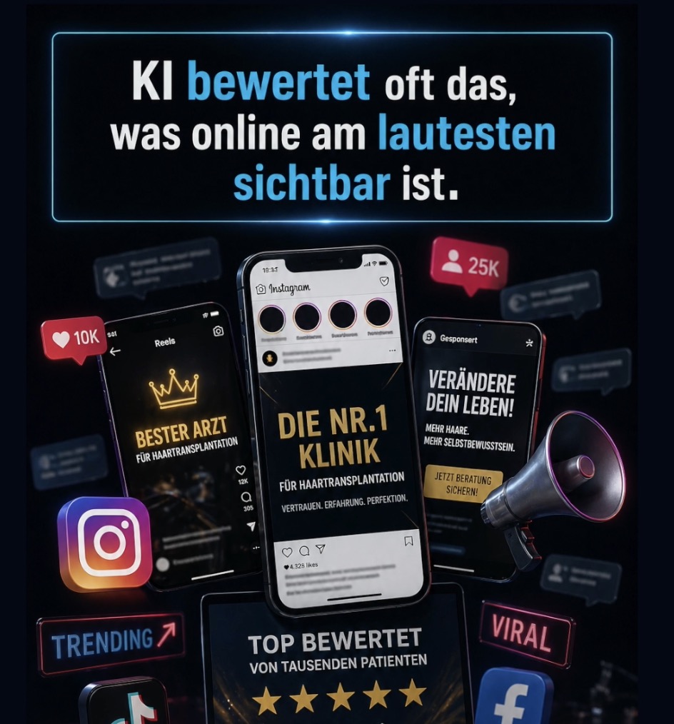 In diesem kurzen Video erkläre ich, warum Systeme wie ChatGPT, Gemini oder andere KI-Modelle bei der Wahl des besten Arztes oder der besten Klinik oft nur das bewerten, was online am sichtbarsten ist – und warum das problematisch sein kann.